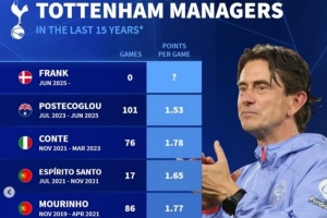 体育资讯6月13日讯 热刺官宣托马斯-弗兰克成为球队新帅,德转对热刺近15年主帅的场均得分进行了统计,博阿斯1.91分最高,波斯特科格鲁1.53分最低。