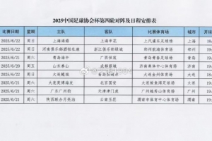 体育资讯6月13日讯 据记者丁旭报道,中国足协公布了2025中国足球协会杯地4轮对阵及日程安排表。与5月29日公布的拟定版相比,有3场比赛比赛日期和开球时间有微调,其中,广东广州豹vs天津津门虎的比赛提前至6月21日进行。