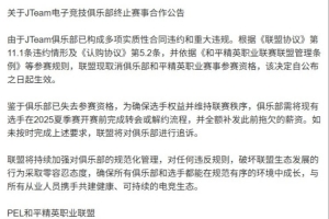 由于JTeam俱乐部已构成多项实质性合同违约和重大违规。根据《联盟协议》第11.1条违约情形及《认购协议》第5.2条,并依据《和平精英职业联赛联盟管理条例》等参赛规则,联盟现取消俱乐部和平精英职业赛事参赛资格,该决定自公布之日起生效。
