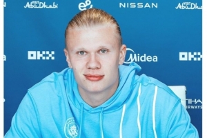 2022年6月13日,哈兰德与曼城签下合同。英超官方社媒晒出哈兰德的签约照,并列出他在曼城的联赛数据。