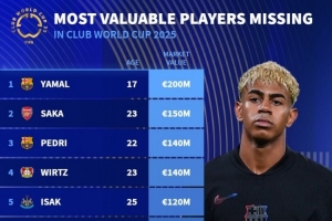 体育资讯6月14日讯 德国转会市场统计了缺席世俱杯球员的身价,并列出榜单,亚马尔2亿欧居首,萨卡1.5亿欧次席。