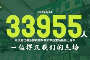 体育资讯6月14日讯 今天下午浙江队主场2-2战平海港的比赛,现场观众33955人,创造了浙江队中超主场上座人数的新高。