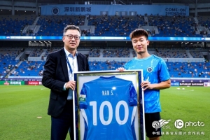赛前,南松领取深圳新鹏城生涯联赛百场里程碑纪念球衣