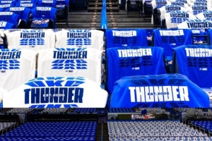 今天,雷霆官方晒出了主场的布置,蓝色和白色的T恤,上面写着,俄克拉荷马雷霆,成立于2008年。