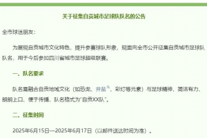 体育资讯6月16日讯 据澎湃新闻报道,四川自贡市教育和体育局自6月15日起向全市公开征集自贡城市足球队队名,用于今后参加四川省城市足球超级联赛。