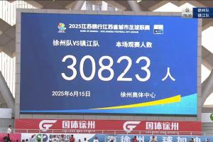 刚刚结束的2025年江苏省城市足球联赛徐州对阵镇江的比赛中,现场观众总数达30823人,这是2025年江苏省城市足球联赛,单场观众首次突破3万人大关。