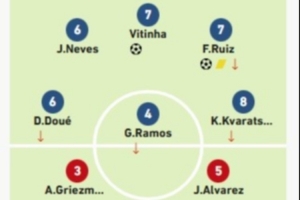 前锋:杜埃-6分、贡萨洛-拉莫斯-4分、克瓦拉茨赫利亚-8分