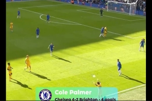 24-25赛季英超第6轮,切尔西主场4-2击败布莱顿,帕尔默在比赛上半场就打进了4球。
