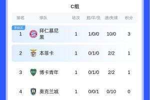 拜仁3分领跑C组,本菲卡、博卡分列二三名,奥克兰城垫底。