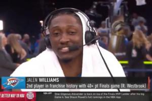 谈到砍下40分,杰伦威在接受场边采访时表示:“是的,当我走进......额......说实话,我的腿......对不起,我累死了,这是实话。”