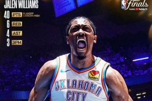 体育资讯6月17日讯 雷霆今天在主场120比109击败步行者,拿下了总决赛天王山之战。杰伦威此役大发神威,25投14中,三分5中3,罚球12中9,轰生涯季后赛得分纪录的40分,另有6板4助,正负值+14。