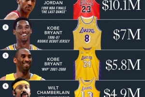 体育资讯6月17日讯 今日美媒Supreme23发布了5月球衣拍卖价格排行,乔丹、科比和张伯伦为前5上榜者。