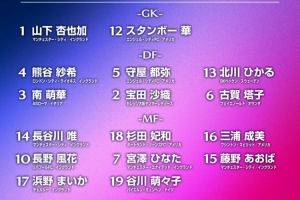 前锋:15-上野真实(广岛三箭女足)、19-中嶋淑乃(广岛三箭女足)、13-矢形海优(仙台七夕女足,首次入选)、17-滨田芽来(RB大宫松鼠女足,首次入选)、16-大泽春花(斯图加特女足,首次入选)、9-山本柚月(东京绿茵女足)、20-爱川阳菜(神户雌狮,首次入选)、18-樋渡百花(东京绿茵女足,首次入选)