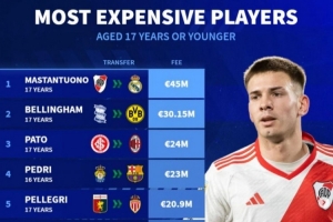体育资讯6月17日讯 德转列U17球员转会费排行,马斯坦托诺4500万欧居首,贝林厄姆3015万欧第二,帕托第三。