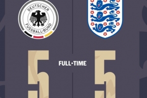 体育资讯6月18日讯 U19欧青赛B组上演了一场进球大战,英格兰U19对阵德国U19的比赛中,前者曾一度以1-5的比分落后,但他们上演了绝地反击最终将比分扳成了5-5的平手。