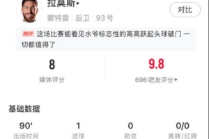 赛后媒体为拉莫斯打出了全场最高评分8分。拉莫斯本场数据统计如下: