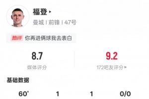 体育资讯6月19日讯 世俱杯小组赛G组第一轮,曼城对阵维达德,福登首发出战,传射建功,还送出2次关键传球,评分8.7。