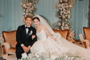 照片上,身穿黑色燕尾服配黑色领结的堂安律,与头戴配有头冠的头纱、身着胸前珍珠点缀的纯白婚纱的妻子明松女士合影。两人脸贴着脸,洋溢着笑容。