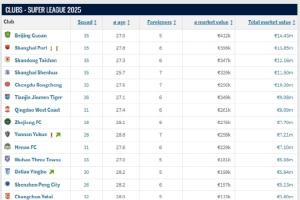 转会市场网2025年中期中国身价例行更新今天完成,对比上次更新,各俱乐部的身价发生了不少变化。北京国安的总身价从1108万欧元涨到了1443万欧元,涨幅达30.2%,取代上海海港成为中国总身价最高的俱乐部。上海海港总身价从1861万欧降到1385万欧,下降25.6%。山东泰山从1364万欧下降到1216万欧,下降10.8%。上海申花从1175万欧下降到1150万欧,基本持平。成都蓉城则从1000万欧小幅涨到1038万欧。其他球队总身价均低于1000万欧,分别是第6名天津津门虎(908万欧)、第7青岛西海岸(809万欧)、第8浙江(770万欧)、第9云南玉昆(721万欧)、第10河南(710万欧)、第11武汉三镇(598万欧)、第12大连英博(594万欧)、第13深圳新鹏城(513万欧)。有三支球队不满400万欧而垫底,分别是第14长春亚泰(360万欧)、第15梅州客家(355万欧)、第16青岛海牛(330万欧)。