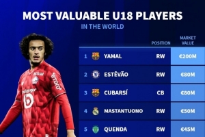 体育资讯12月14日讯 德国转会市场列出了U18球员身价排名,亚马尔2亿欧居首,埃斯特旺、库巴西次席。