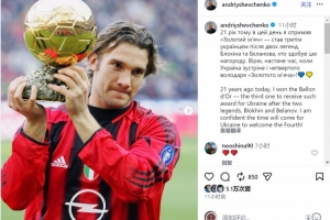 舍甫琴科社媒晒出自己与金球奖杯的合照,配文:“21年前的今天,我赢得金球奖,成为继布洛欣和别拉诺夫之后,第三位获得这一奖项的乌克兰球员。我相信乌克兰终会迎来第四位金球奖得主!”