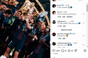 在巴黎身披7号的克瓦拉茨赫利亚社媒晒出捧杯照片,庆祝球队夺冠,配文:“7是不错的数字。”
