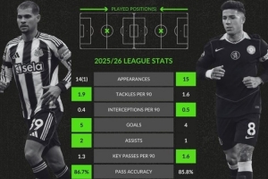 吉马良斯(纽卡):14次首发、1次替补,5球2助攻。场均1.9抢断、0.4拦截、1.3关键传球、传球成功率86.7%,获评7.03分