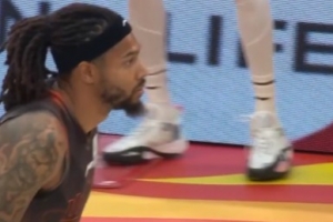 波杰姆抢板空中坐到OG身上 下落踢到后者鼻子 回看后未升级