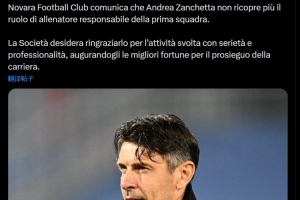 “诺瓦拉足球俱乐部发布通告:安德烈·赞切塔不再担任一线队主教练。”