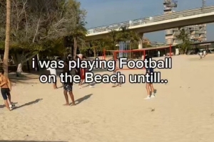 巴萨边锋亚马尔在迪拜度假,他来到海滩与孩子们一起踢球。亚马尔面带笑容,完全融入这场沙滩足球赛,给孩子们带来了惊喜和快乐。