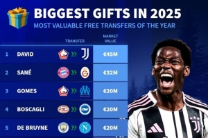 体育资讯12月26日讯 德国转会市场统计了2025年自由身转会球员的身价,并列出榜单,戴维4500万欧居首。