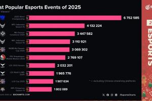 体育资讯12月26日讯 Esports Charts统计2025年最受欢迎的电竞赛事前十名:(观赛峰值)