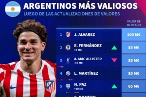 体育资讯12月27日讯 德国转会市场更新了各大联赛球员的身价,并列出阿根廷球员身价排名,阿尔瓦雷斯1亿欧居首。