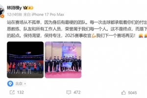 林诗栋在个人微博写道:站在赛场从不孤单,因为身后有最硬的团队。每一次击球都承载着你们的付出。感恩教练、队友和所有工作人员,荣誉属于我们每一个人。这不是终点,而是下一程的起点。保持渴望,保持专注,2025赛事收官,我们下一个赛场再见!