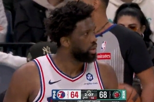 GIF-恩比德大帽韦尔斯,还倒地救球