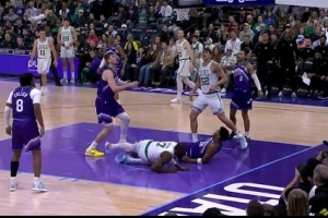 波杰姆抢板空中坐到OG身上 下落踢到后者鼻子 回看后未升级