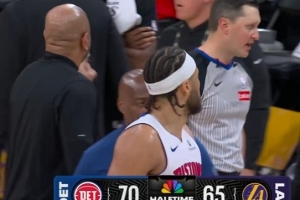 詹姆斯快攻合球撞倒米勒 裁判吹罚防守犯规 黄蜂教练挑战失败