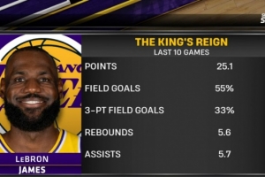 据比赛转播商Spectrum SportsNet赛后统计,詹姆斯在最近10场比赛中场均得到25.1分5.6篮板5.7助攻,投篮命中率55%,三分命中率33%。