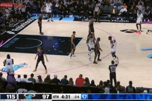 詹姆斯快攻合球撞倒米勒 裁判吹罚防守犯规 黄蜂教练挑战失败