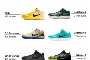 排名第3的是Kobe 4 Protro Gift of Mamba(黑曼巴),上脚时长487分钟。