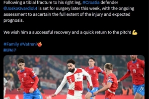 体育资讯1月6日讯 在格瓦迪奥尔遭遇右腿胫骨骨折并将接受手术后,克罗地亚足协为他送上了祝福。