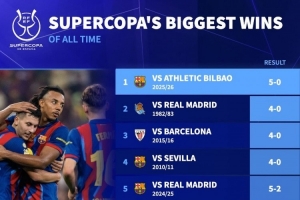 体育资讯1月8日讯 西超杯半决赛,巴萨5-0大胜毕尔巴鄂竞技。德国转会市场统计了西超杯历史最大比分胜利,并列出榜单,巴萨5-0毕巴居首。