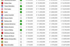 体育资讯01月16日讯 据记者Alex Crook报道,格伊在曼城的周薪为30万镑。这一薪水将使他在曼城队内排在并列第二。