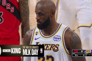湖人VS猛龙第四节,詹姆斯隔扣造成犯规走上罚球线,主场球迷喊起MVP的呼声。