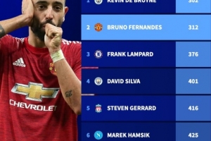 连续两个赛季英超送出10+助攻,B费成为鲁尼后首位曼联球员
