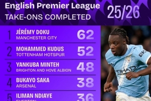 体育资讯1月28日讯 Squawka统计了本赛季球员在英超的成功过人次数,并列出榜单,多库62次成功过人居首。