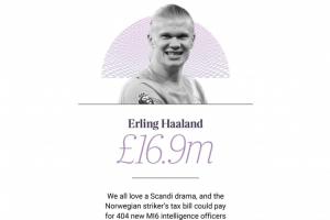 据榜单数据显示,曼城前锋哈兰德周薪约50万英镑,年度奖金高达1000万英镑,以每年缴纳1690万英镑的税款位列榜单第72位。哈兰德也是这份榜单中最年轻的人(25岁)。