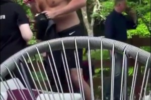 聊啥呢?杨瀚森场边和阿夫迪亚有说有笑 还靠了下对方的肩膀