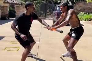 聊啥呢?杨瀚森场边和阿夫迪亚有说有笑 还靠了下对方的肩膀