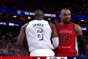 聊啥呢?杨瀚森场边和阿夫迪亚有说有笑 还靠了下对方的肩膀